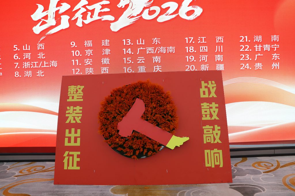 儀式進入最高潮——擊鼓出征環節震撼上演。銷售管理部部長熊迪凱揮槌擊鼓,三聲鼓響如春雷炸裂,振奮人心。各省區團隊回聲嘹亮,口號震天,鼓聲與吶喊交織成出征的號角。全體將士邁著堅定有力的步伐,正式踏上2026年的嶄新征程。