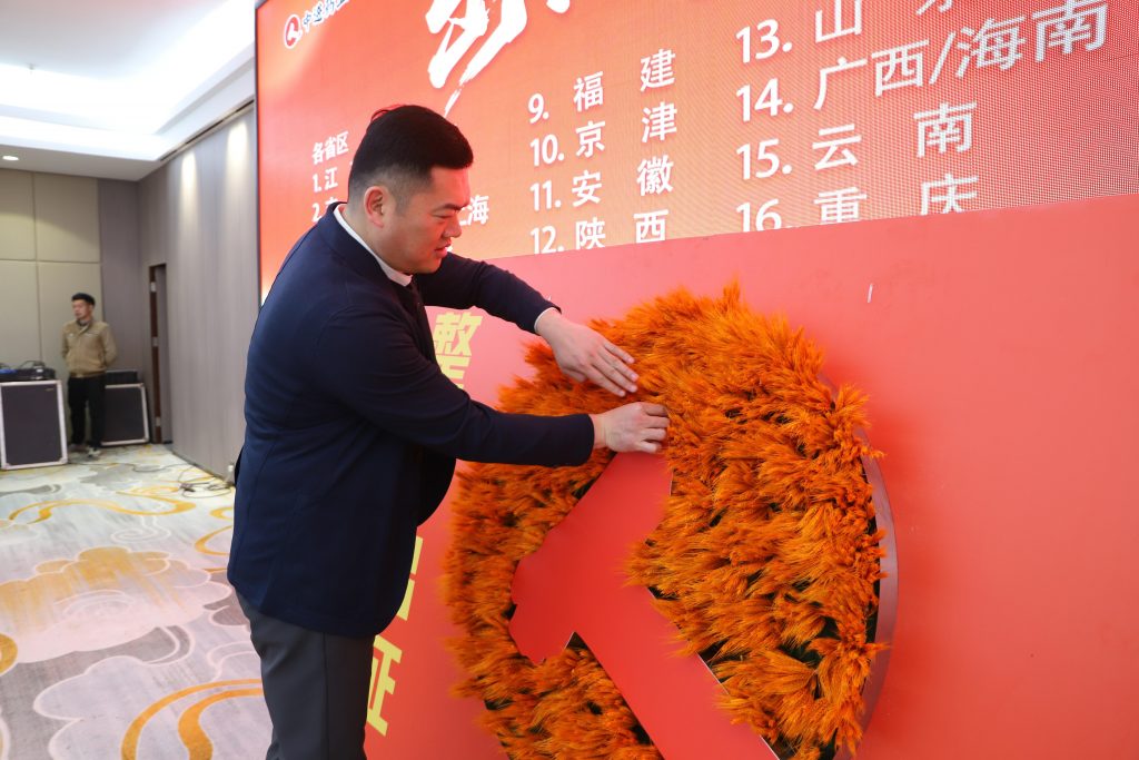 舞臺一側,責任狀簽訂席莊嚴肅穆;舞臺中央,“仁和大麥墻”巍然矗立,金穗燦然,寓意業績“大賣”、碩果盈枝。在激昂奮進的樂曲聲中,各省區團隊依次登臺。團隊成員手持金色麥穗肅立后方,象征同心共擔、使命共赴。李總首先為公司十周年員工頒發紀念相框,致敬他們與中進風雨同舟的堅守。隨后,各省區團隊將麥穗鄭重插入“大麥墻”,這一儀式感十足的動作,寓意著將目標扎根沃土,靜待豐收在望。