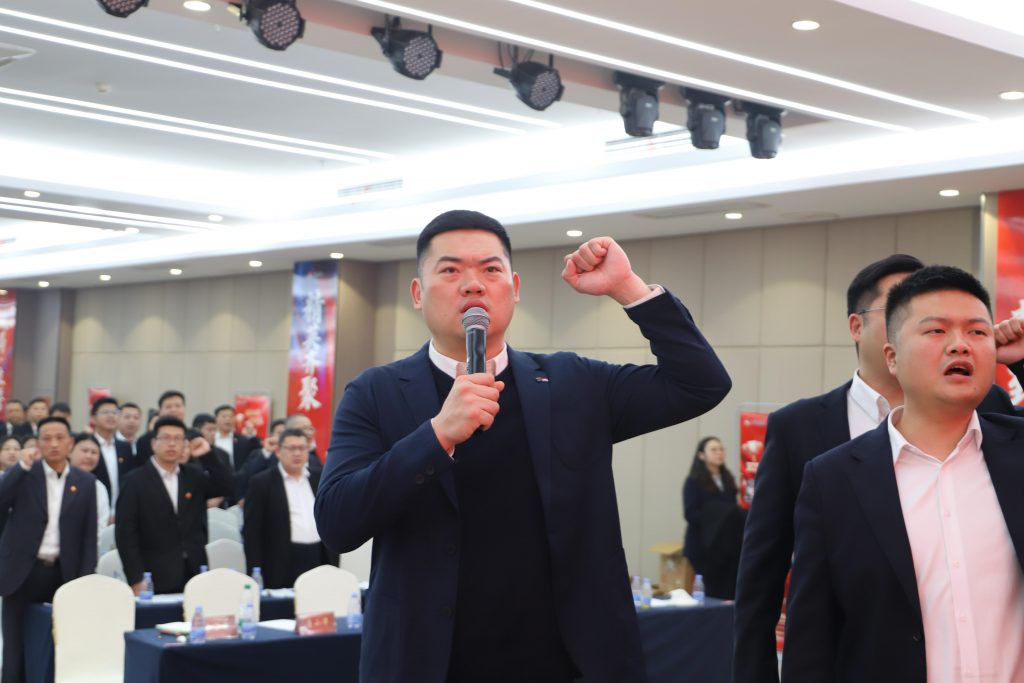 儀式在主持人劉永權莊重而富有感染力的開場中拉開帷幕,現場氣氛瞬間點燃。在各省區整齊列隊的見證下,公司總經理李圳帶領全體市場營銷將士高舉右拳,莊嚴宣誓。誓言錚錚,響徹全場,這不僅是對年度目標的堅定承諾,更是中進鐵軍勠力同心、使命必達的精神宣言。